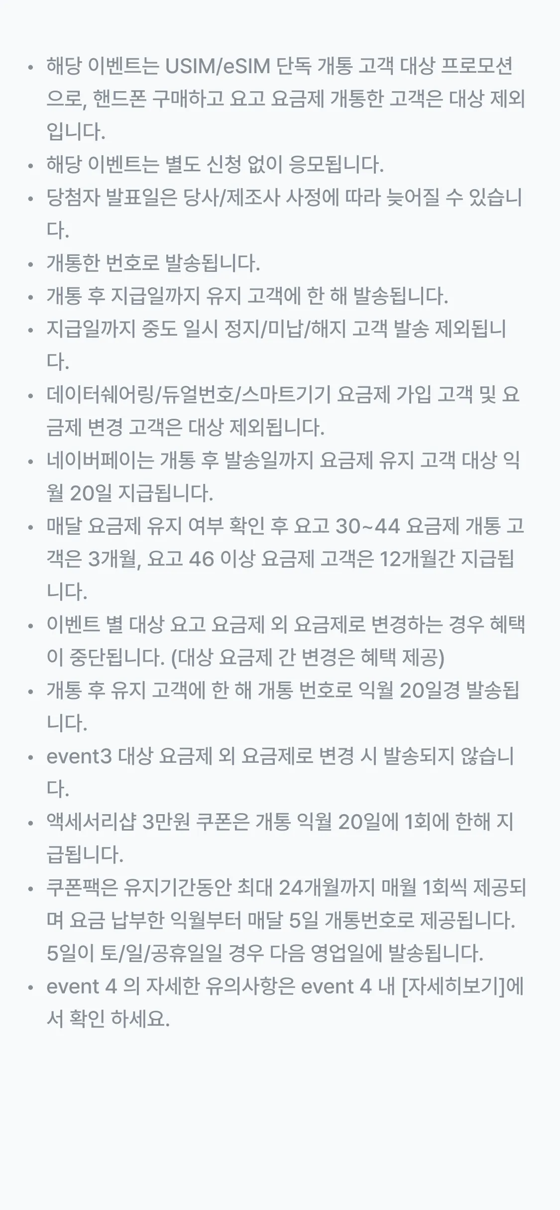 네이버페이는 개통 후 발송일까지 요금제 유지 고객 대상 익월 20일 지급됩니다.