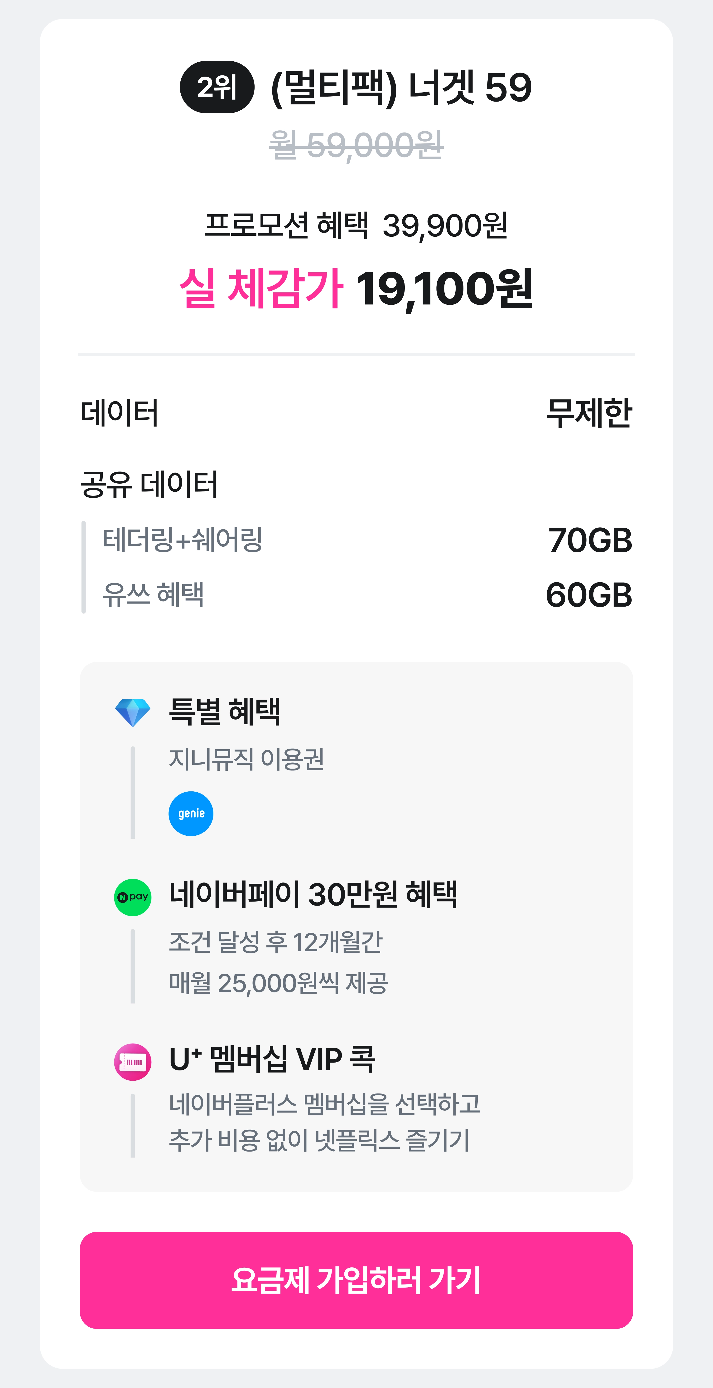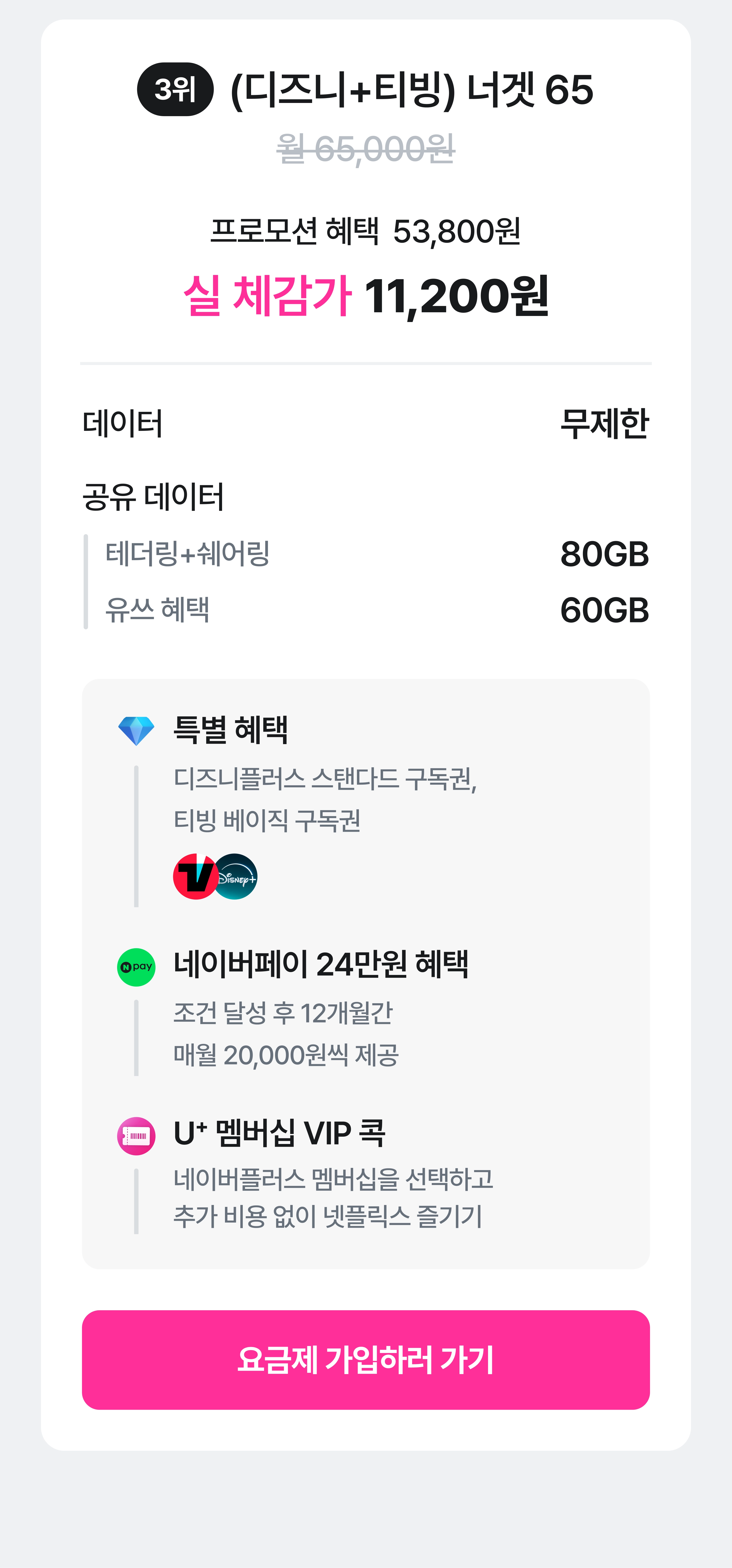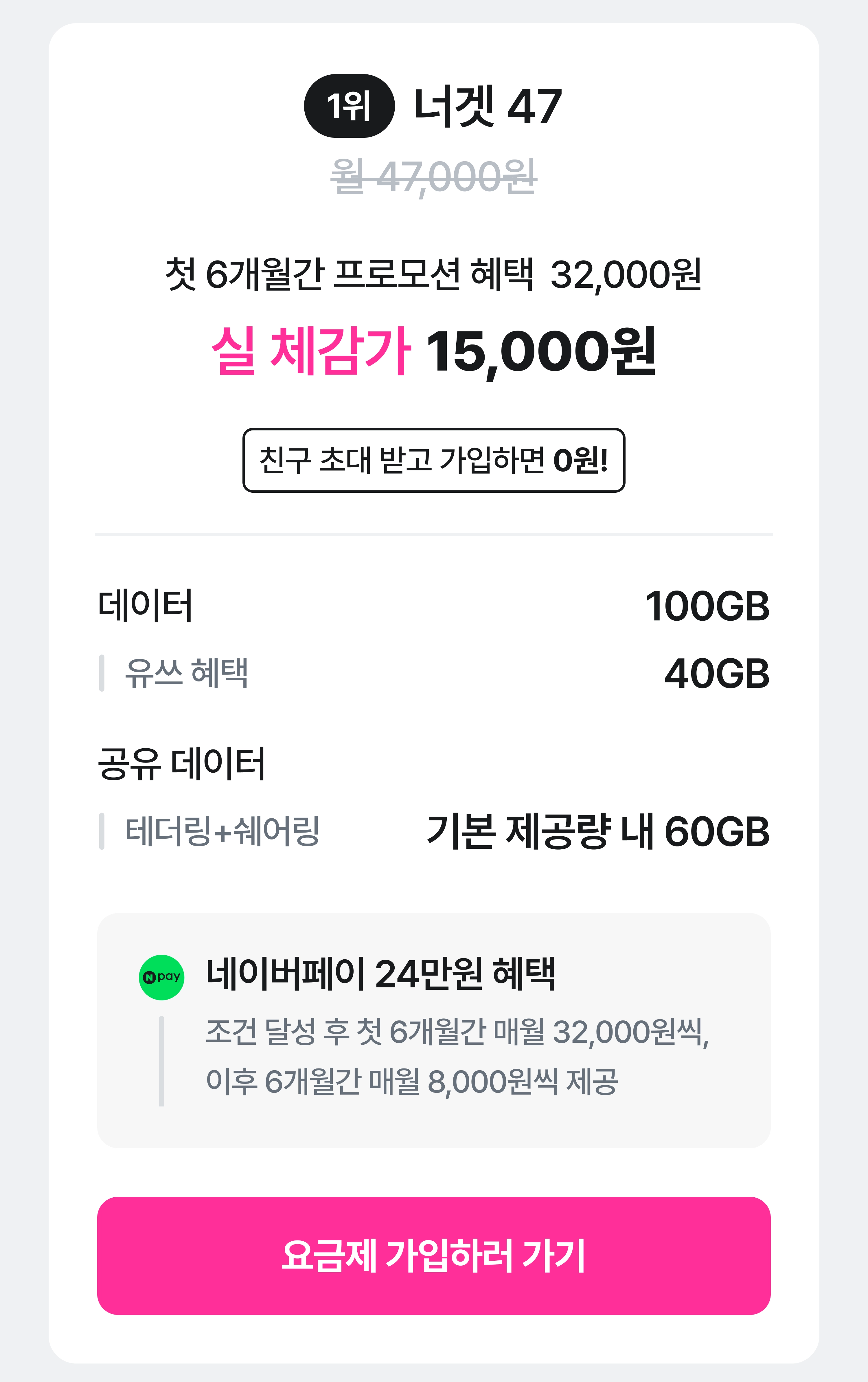- 대상 요금제: [친구초대] 너겟47, [친구초대] (멀티팩) 너겟59, [친구초대] (디즈니+티빙) 너겟65