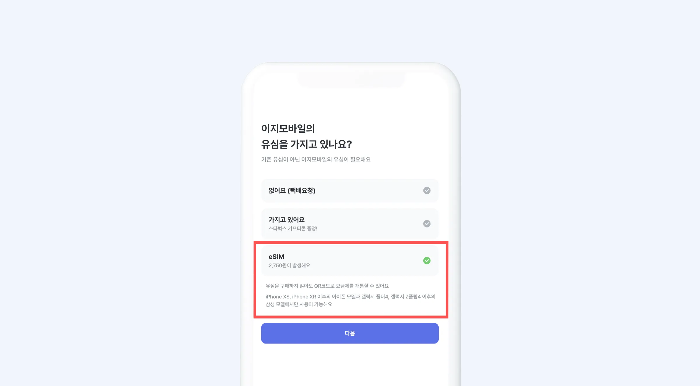 만약 eSIM을 지원하는 단말기를 가지고 있다면 별도의 물리적인 USIM을 준비하지 않아도 요금제 개통이 가능해요.