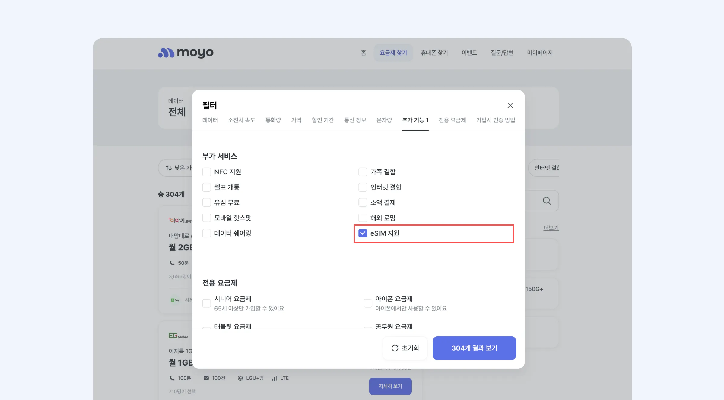 모요 > 요금제 찾기 > 필터 > 부가서비스 > eSIM 에서 필터로 확인해요.