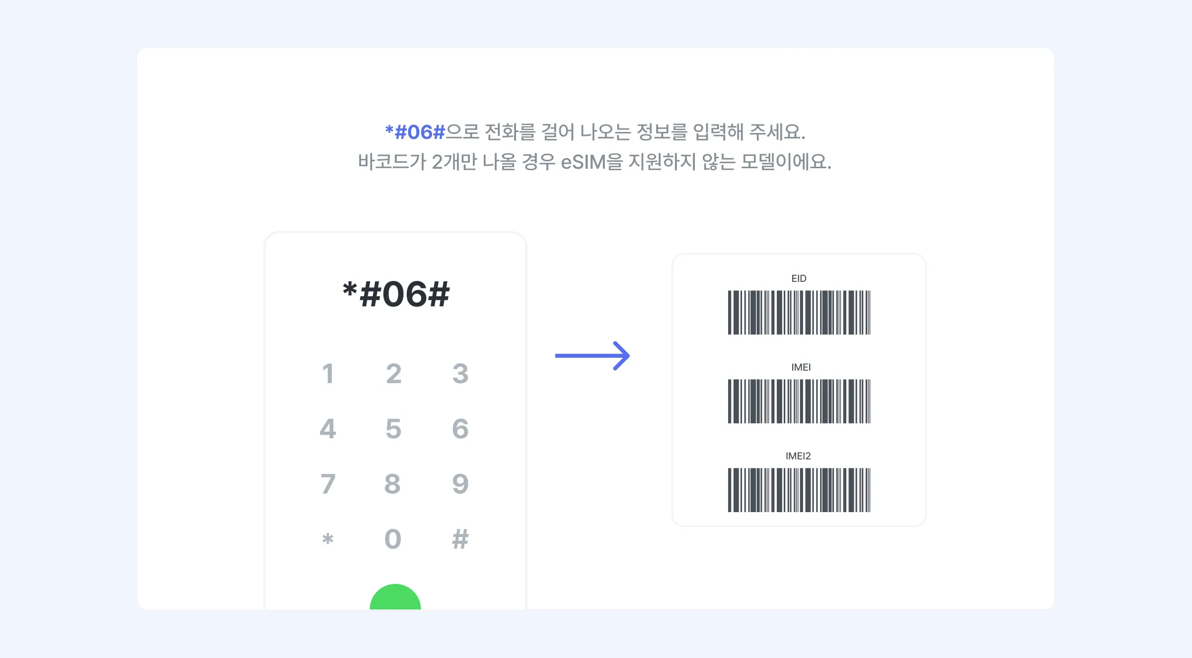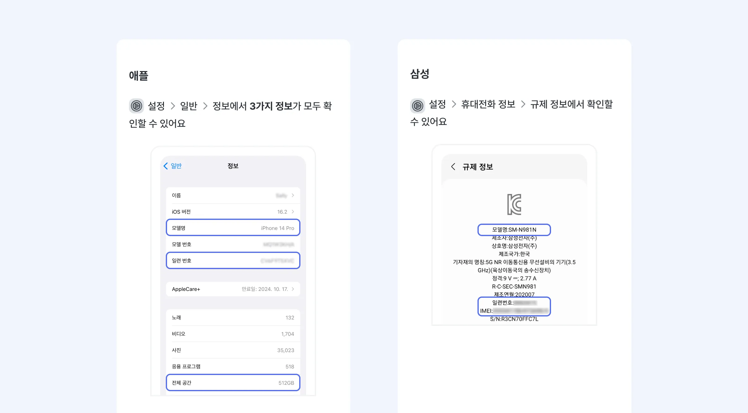 eSIM은 물리적인 유심이 아닌 휴대폰의 정보를 가지고 개통하기 때문에 몇 가지 휴대폰 정보를 제출해야 해요. 휴대폰의 모델명과 일련번호, EID, IMEI 값을 입력하면 되는데 용어가 어려워 보이지만 휴대폰에서 쉽게 찾을 수 있어요.