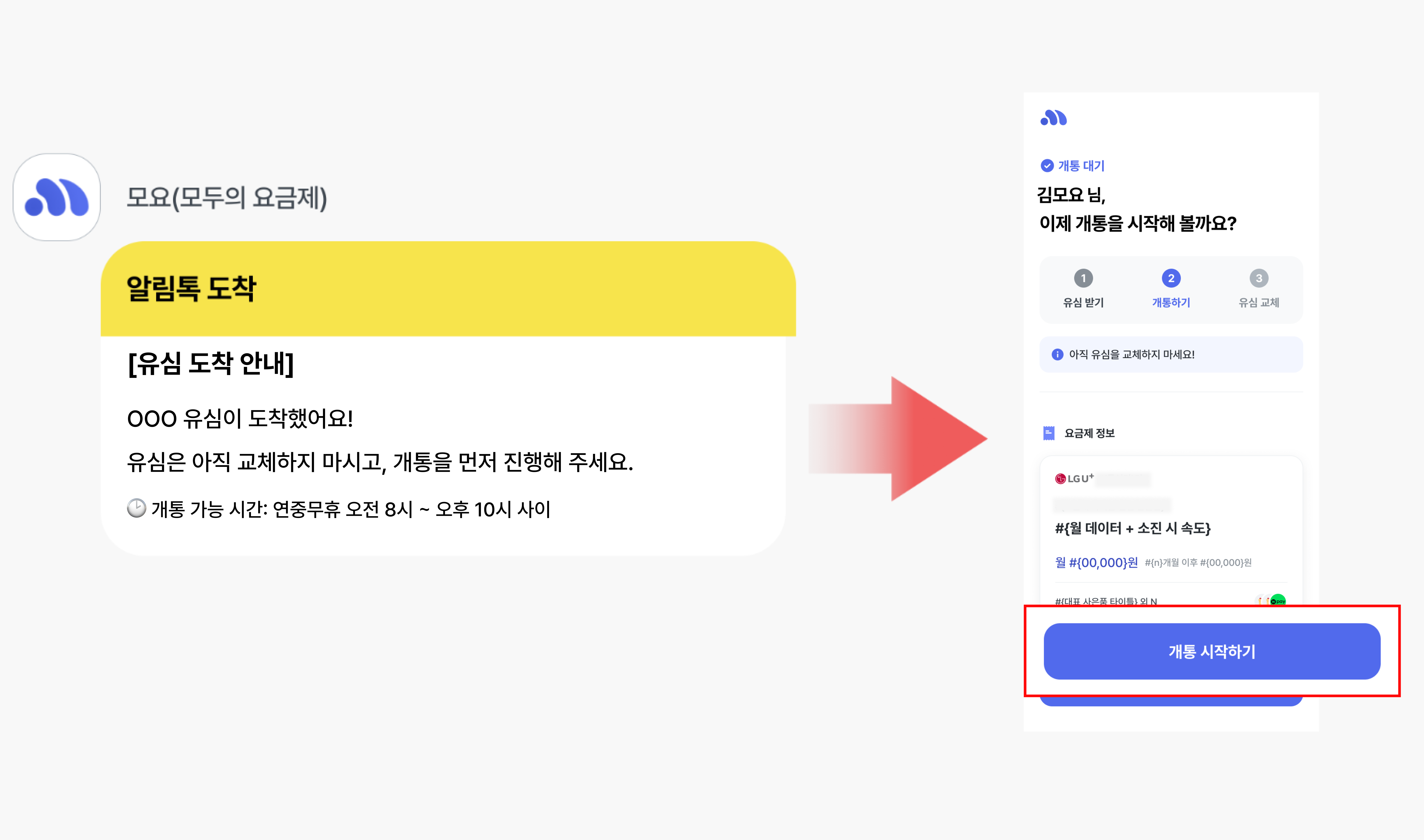 모요개통 요금제의 경우 유심 배송 현황을 확인할 수 있도록 알림톡을 지원하고 있어요.