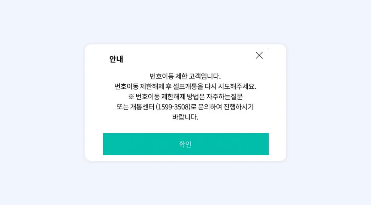 이전 통신사에서 번호 이동을 한지 3개월이 지나지 않았을 경우 (번호 이동일, 명의변경일, 신규 가입일로부터 3개월) 아래와 사진과 같이 번호 이동 제한이 발생해요.
