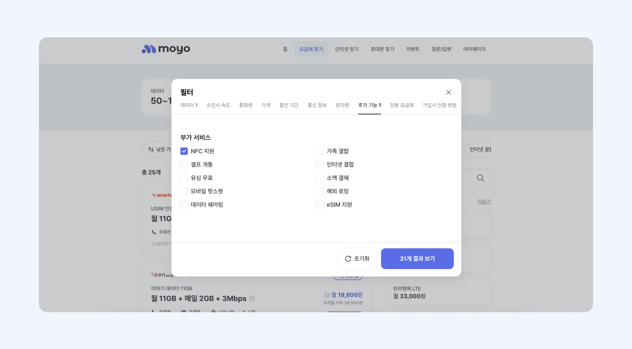 모요 요금제 찾기 > 필터를 통해 NFC 지원 요금제를 찾아볼 수 있어요