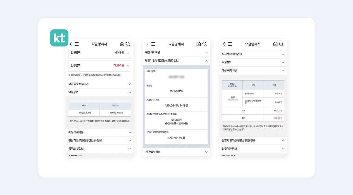 대리점에서 핸드폰을 일시불로 구매했다면 핸드폰 기기값(단말기 할부금)이 나오지 않겠지만, 할부로 구매했다면 매월 단말기 할부금이 나와요. 보통 24개월 할부로 진행을 하는데, 만약 12개월을 냈다고 하면 12개월만큼의 남은 기간 단말기 할부금은 통신사를 해지하더라도 계속 내야해요.