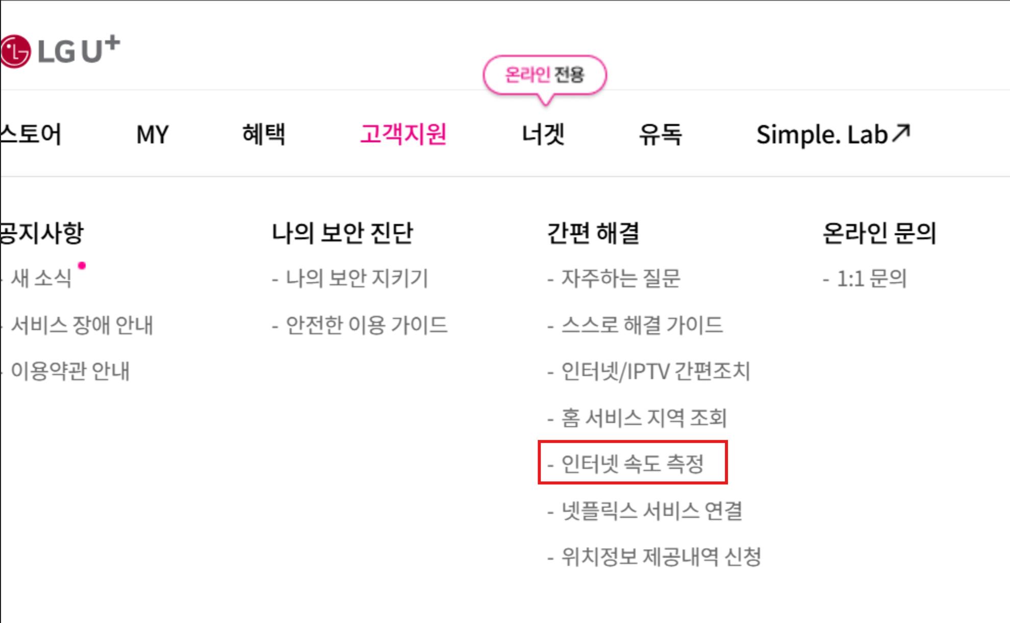 LG U+ 홈페이지 > 고객지원 > 간편해결 > 인터넷 속도 측정